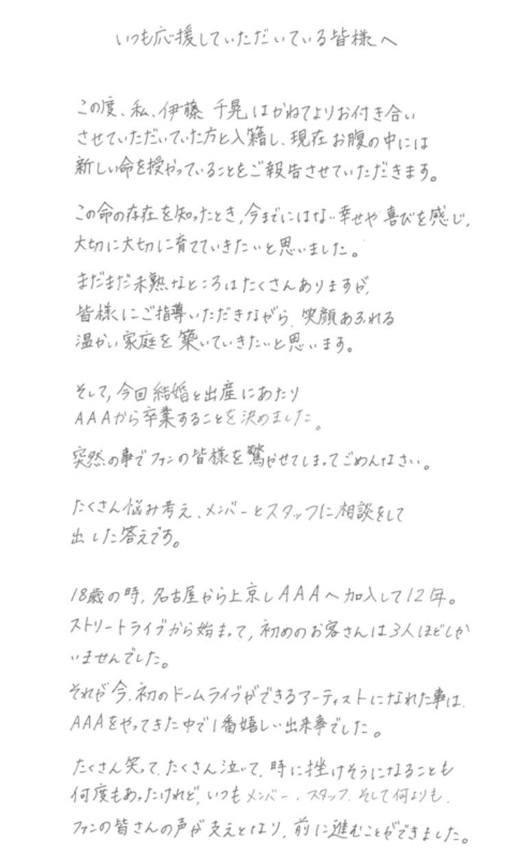 続けて「そして、今回結婚と出産にあたりAAAから卒業することを決めました。突然の事でファンの皆様を驚かせてしまってごめんなさい」と発表。